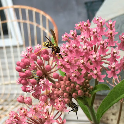 Click HERE to see the video of a sleeping Monarch Caterpillar, a hungry one eating a flower, and a wasp fight.
