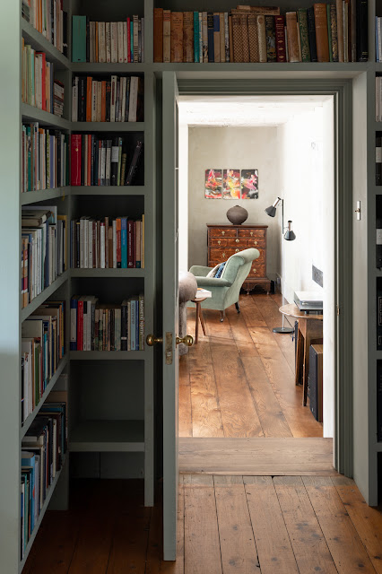 I adore the wide board floors with the beautiful patina. The library off the living room looks as if it has bookshelves on all the walls and that's a good thing because you can't have too many (books or shelves). via